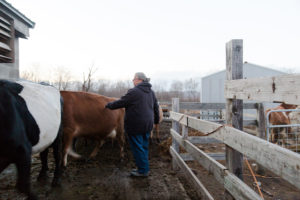 The herd is milked by machine, but other chores are done by hand. “Four times a day we scrape down the hay so they eat more.” Around 2:30 in the afternoon the cows are let out to exercise for a couple of hours. Beyond her “2,000-pound puppy dogs” in the barn, Hubbert keeps more cows in a windproof shelter and calves in hutches outside, with hay for bedding. In warm weather, some are pastured on 30 acres in nearby Middletown. She recently leased 157 more acres nearby and is getting the fields ready to become pastures.