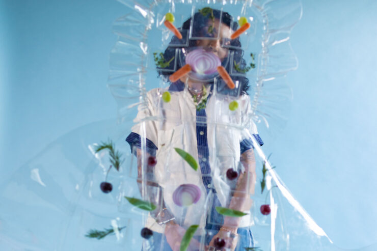 Froot Loop ear cuffs, banana skin flip-flops, hot dog bun sectionals, and checkerboard skirts woven from clammy-looking processed cheese…