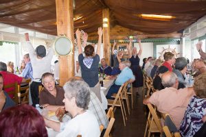 I followed along as a small crew broke off and made their way to the dining hall perched above the port. Clusters of members from each gastronomic society shuffled to deliver massive pans of paella, each four inches in diameter. Inside were long tables packed with active and retired fishermen, singing songs and waving handkerchiefs in the air. As the only guest in contemporary clothing, I felt like an alien from another planet, here to learn to swing my chalice and sing their songs for one surreal night.