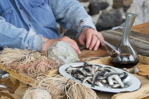 Characters were crooning from balconies and swash-buckling along the pier. Under a nearby alcove, I found the real action: two women were seated at a rustic table, a mountain of delicate fish bones collecting at their espadrilled feet. Peering through spectacles, they were meticulously scrubbing the delicate skin of each individual anchovy, trimming the fins and tails with manicure scissors, and carefully tapering the sides of each fillet to create a pleasing shape. Each little flavor bomb was then laid flat and packaged, unless it was scooped up, sandwiched between two pieces of bread and promptly devoured by passerbuy.
