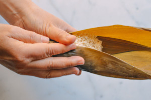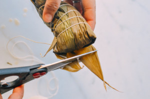 Once the 7-8 hours is up, eat the zongzi while they’re hot! Sweet zongzi can be enjoyed at room temperature, but savory zongzi are really the best when they’re steamy and delicious. To eat, simply cut the twine and unwrap the leaves to reveal the zongzi inside. Zongzi can be frozen after they cool to room temperature. To reheat, re-boil the zongzi in water for 15-20 minutes.