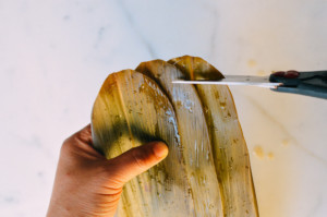 Soak the leaves overnight. The next day, wash and rinse each leaf front and back, keeping them in a large bowl or tub of water until wrapping time so they don’t dry out.