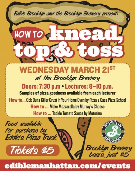 On Wednesday, March 21st from 8 pm to 10 pm, we’re teaming up with some of the most knowledgeable folks around for How to Knead, Top & Toss at the Brooklyn Brewery, an evening devoted entirely to making perfect pizza.