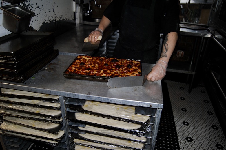 Mama’s Too’s popularity started on social media, with those glistening rings of (hand-sliced) pepperoni, Tuttolomondo assesses. In March of 2018, they appeared on an Eater map, then the pepperoni was deemed the second best square slice in New York by Grub Street.