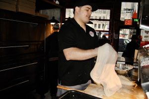 Wells reviewed Mama’s Too and gave it one star (the first slice shop to receive a star from the paper of record). He describes hearing about the restaurant from pizza connoisseurs Ed Levine and Adam Kuban. “The pizzas I’d always venerated were the brick-oven ones… I ate a lot of [slice] pizza when I was younger, and then I just stopped thinking about it.” But then, Wells noticed that some were reconsidering the slice, like Best Pizza’s Frank Pinello. One could also consider Scarr’s Pizza, where local wheat is freshly milled daily, and Paulie Gee’s Slice Shop, that coats the bottom of their square pies with sesame seeds, in this camp. “What [Tuttolomondo] and a few other people are doing, it was like pizza news. And we’re a newspaper.”