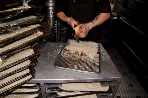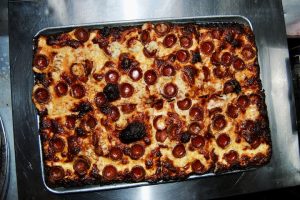 When they opened, Mama’s Too had pasta and salad on the menu; they fell to second priority when they realized how special their customers found the pizza. Still, Tuttolomondo couldn’t resist his own inspiration; the candied walnut, pear, and Gorgonzola salad became the poached pear square slice: “I liked the way that the Gorgonzola melted, the poached pears get a good spicy cinnamon, we put our homemade hot honey over the top… that all marries together with a sweet and salty balance that people crave.” Though poached pear isn’t a typical flavor at a pizzeria, Tuttolomondo maintains it sells just as well as the others, as do his other nontraditional slices. Usually, there’s a cacio e pepe pie, but he’ll also make specials (announced on Instagram) like an elote-inspired pie, or an ode to the bacon, egg and cheese. “Sometimes, two separate lines will form if people are waiting for the fennel-sausage or the pepperoni, but usually they’ll get whatever’s at the counter.”