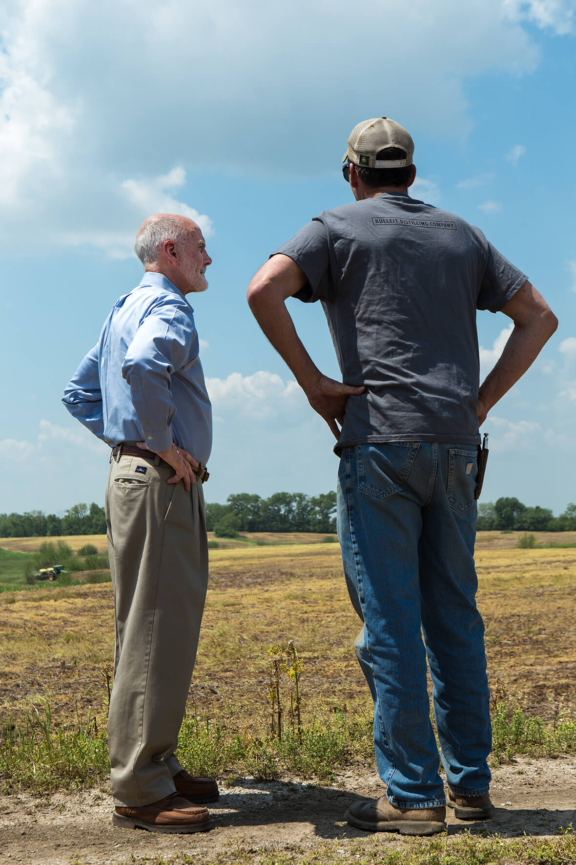 TB: Well, at the new distillery in Shelbyville what we were doing is going from seed to grass. Non-GMO seed, special kind of seed, we have 300 acres there, we own 350 acres back here, we own a thousand acres across the street, and then right in that immediate area farmers will grow the grain for us. They grow our grain, they grow our seed, they grow our non-GMO grain. The wisdom is now that you rotate the wheat and other grains with soy beans. There’s a whole methodology of doing that with energy efficiency. With environmental responsibility. You don’t want erosion, you know, et cetera, et cetera. You don’t wanna use a lot of chemicals.