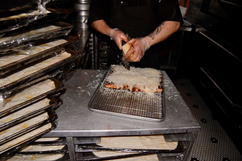Wells reviewed Mama’s Too and gave it one star (the first slice shop to receive a star from the paper of record). He describes hearing about the restaurant from pizza connoisseurs Ed Levine and Adam Kuban. “The pizzas I’d always venerated were the brick-oven ones… I ate a lot of [slice] pizza when I was younger, and then I just stopped thinking about it.” But then, Wells noticed that some were reconsidering the slice, like Best Pizza’s Frank Pinello. One could also consider Scarr’s Pizza, where local wheat is freshly milled daily, and Paulie Gee’s Slice Shop, that coats the bottom of their square pies with sesame seeds, in this camp. “What [Tuttolomondo] and a few other people are doing, it was like pizza news. And we’re a newspaper.”