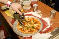 Pizza a Casa Pizza School kicked off the evening with a lecture on the foundation of crust. Some of the things we learned? Avoid using a baking sheet–it makes the pizza sweat, resulting in a soggy pizza. Instead, invest in a pizza stone. Your pizza will benefit from having the moisture pulled out. Also, avoid rolling pins, and while it may be tempting, don’t throw around your dough like you see on TV. A pizza peel is a handy way to shimmy your pizza in and out of the oven, but a piece of cardboard will also do the trick. Speaking of ovens, pre-heating is key (an hour should suffice) and as irresistible as it is, don’t open the door while the pie is cooking. If you weren’t at the lecture, bummer! Twelve lucky audience members got to taste Mark Bello’s creation, fresh out of the oven.