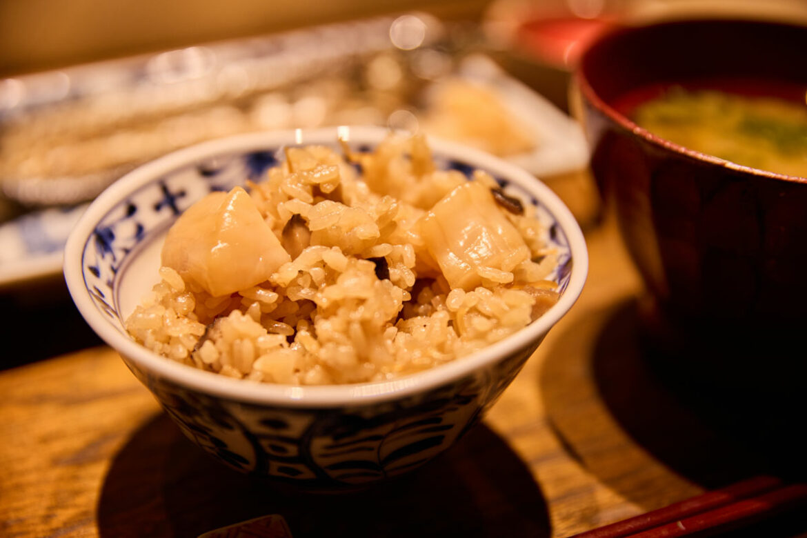 Place the dashi sachets, diced dried shiitake, and dried scallops on top of the rice. If your scallops are NOT sashimi grade, cut them into ¼ sizes and add them to the rice now. Start cooking the rice. If your fresh scallops are sashimi grade, you may marinate them in a mixture of light soy sauce and sake (ratio 2:1) for 10 minutes, then drain excess moisture. Once the rice is cooked, remove the dashi sachets and mix well. If your scallops are sashimi grade, mix them in at this stage. Serve in individual bowls and garnish with mitsuba leaves or shredded nori.